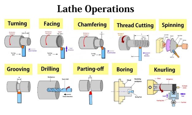 Máy có thể thực hiện nhiều nguyên công như tiện mặt đầu, tiện trụ, khoan, doa, tiện ren và tiện côn.